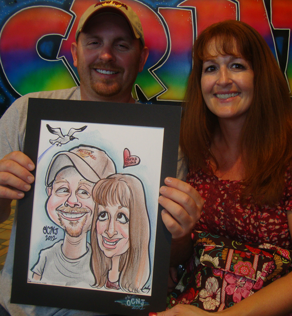 These two were entertaining me while I drew them. Think I got their personalities, too...This couple were newlyweds! We had a nice time chatting as well...so much so, that I made sure to include HER ring in the caricature, but forgot about his! They came back the next day and I added it in. :-)