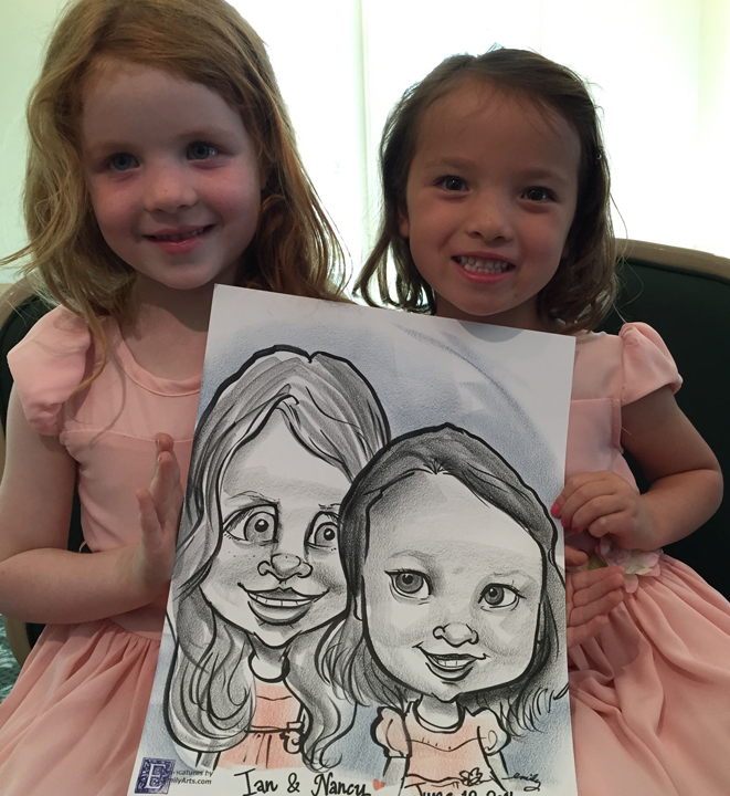 "Emily was amazing. My wedding (6/12/2016 in Monroe, NJ) had 30 kids < 18 years old in attendance. Emily was able to draw them in groups, keep them engaged, and managed not to lose her sanity in the process! She was a consummate professional and and drew lovely caricature portraits for adults as well. I only wish she had taken time to eat! I would definitely recommend Emily for any event. Her style was a perfect bled of portrait-style and cartoon-ish embellishment, depending on what the subject wanted. My (now wife) and I got our portraits done last, and they came out amazing. it's been framed already and it one of our favorite keepsakes from the day."