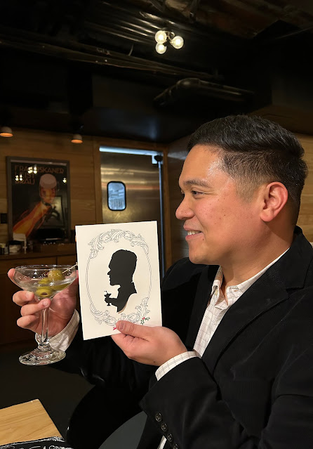 Silhouettes are inherently elegant...as they distill someone's likeness to its simplest form. And the process is amazing to watch! So when I connected me with this client, they opted to have me cut them at a very nice holiday cocktail party in a restaurant...here are some images from my evening.