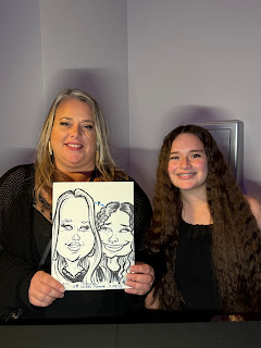 I'm often amazed at the incredible venues, especially historic ones, where I get to practice my art. This particular event was a fundraiser for the Leukemia and Lymphoma Society, in the upstairs balcony of the Queen, a venerable old theater in Wilmington, Delaware. I've drawn there before, but was always downstairs in the main space. I wondered if folks would find me and my mini-caricatures, but shouldn't have worried---I was slammed as usual!